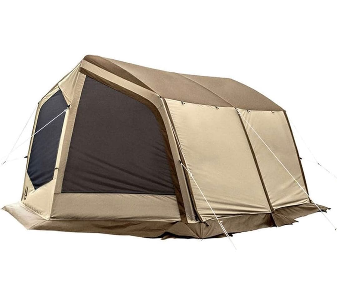 - 設営が非常に楽なテントです。 広げて、上部の骨組みのロックを下ろすだけで展開完了。 あとは窓の骨組み入れて、ロープ貼りとペグ打ち、小さな屋根つけて完成。 展開や収納が楽なのが利点であり、天気の良いオンシーズンなら良いアイテムです。 不安な点を挙げるなら、生地の薄さとフレームの柔さ。 雨天や寒い時期の使用については、タープを併用するとかした方が良いかも。 骨組みは柔いので、しっかりロープとペグ打ちして固定すれば大丈夫かもです。